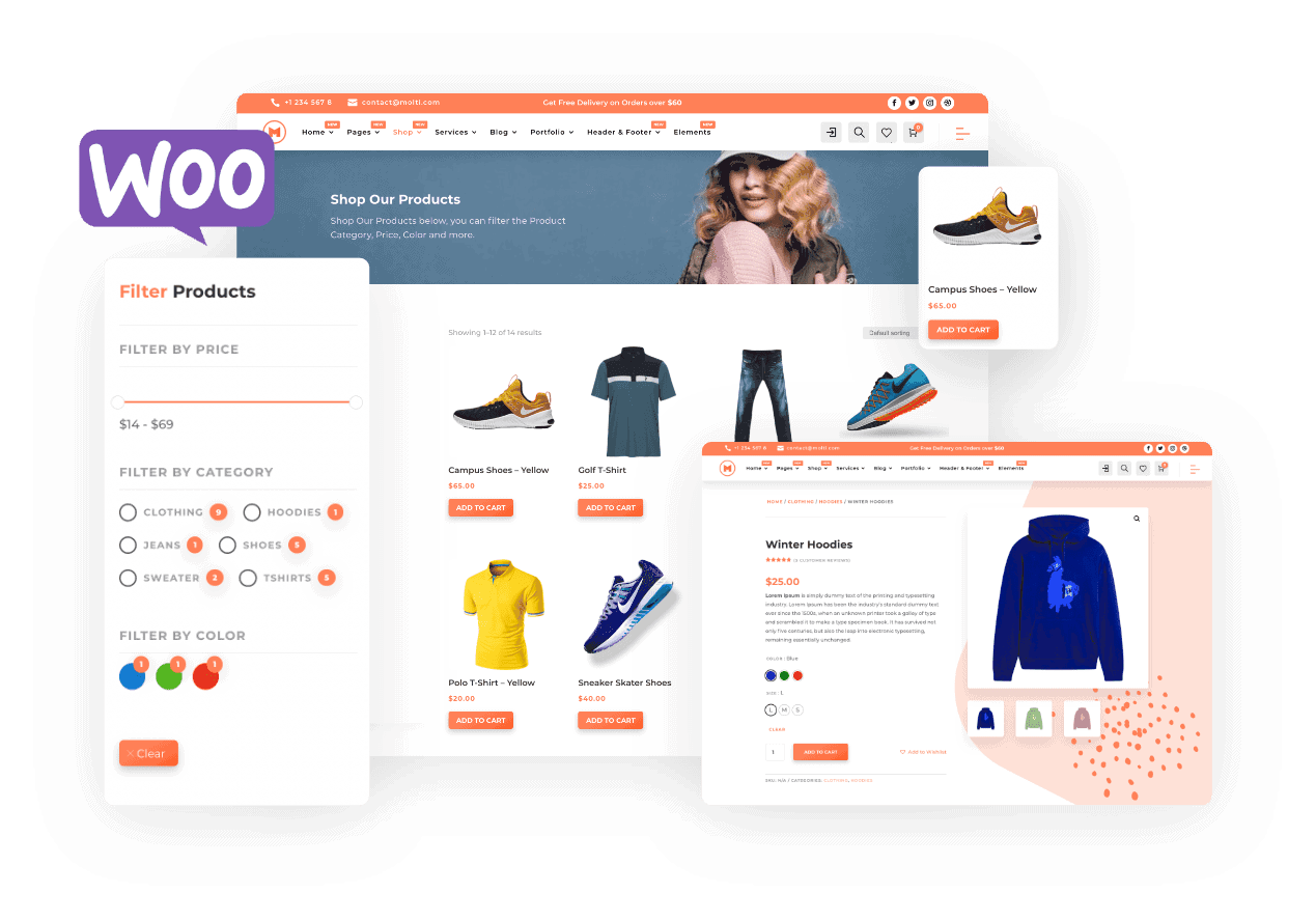 The Molti Ecommerce provides you more benefits over the Business version of the Molti. It comes with amazing WooCommerce Functionalities and Features that will help you set up your Ecommerce store as well as any Business site in minutes.